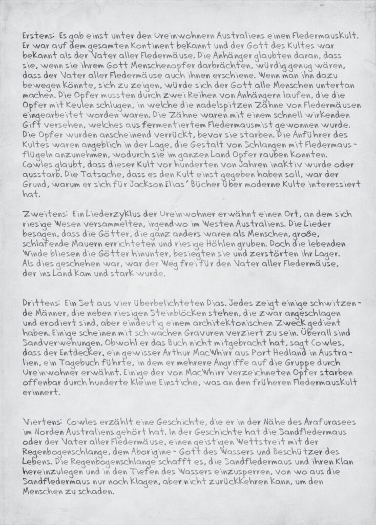 Jonatham, Hans, Victoria und William beschließen Professor Dr. Anthony Cowles noch einmal aufzusuchen, nachdem sie ihn am Vorabend nicht mehr zu den Vortragszeiten erreichen konnten. Dieser ist erfreut, wenn auch verwundert über den Besuch und erzählt bereitwillig noch einmal, was das Publikum am Abend zuvor schon ermüdend fand. Er berichtet von einem Sandfledermaus-Todeskult aus Australien, von einem Cthulhu, der scheinbar überall mit verschiedenen Dingen in Verbindung steht, scheinbar aber ein uraltes Böses darstellt. Auch von einem verstörend widerwärtigen Buch, dass er las, Ponape Scriptures, berichtet er bereitwillig. Dazu zeigt er Dias auf Bildplatten von Arthur Mac Whirr, welche er vom Testamentsvollstrecker und Bauingenieur Robert Mackenzie bekam.