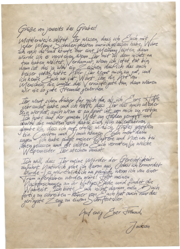 Als die Gruppe später zu Carlton Ramsey kommt um der Testamentseröffnung beizuwohnen kommt verblüffendes zu Tage. Das Testament, welches einen Tag vor Elias´Tot aufgesetzt wurde bedenkt die ganze Gruppe als Erben. Er hinterlässt der Gruppe ein beträchtliches Vermögen, so viel, dass selbst William und Jonathan beeindruckt die Augen weiten. 50.000 Dollar sollen nun dazu dienen Jacksons letzte Ermittlungen fortzuführen und zu finanzieren. Ramsey soll dabei als Kontaktmann dienen und die Ausgaben und Informationen koordinieren. Im Notfall kennt er sogar noch Andere, die vielleicht helfen würden, den Fall zu lösen.