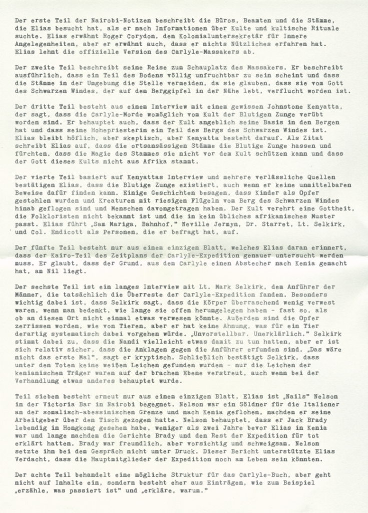 Als letzten Hinweis empfiehlt er das Ju-Ju Haus und einen gewissen Silas N’kwane. Er könne vielleicht mehr über die Kulte sagen und auch gute Kunstgegenstände bei ihm erwerben.